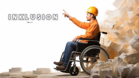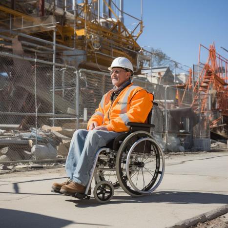 Mann im Rollstuhl und Sicherheitsausrüstung auf einer Baustelle, symbolisiert Inklusion im Bauwesen.