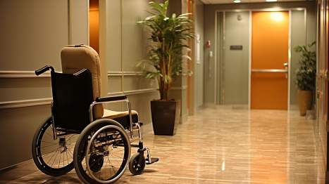 Leerer Rollstuhl im Krankenhausflur.