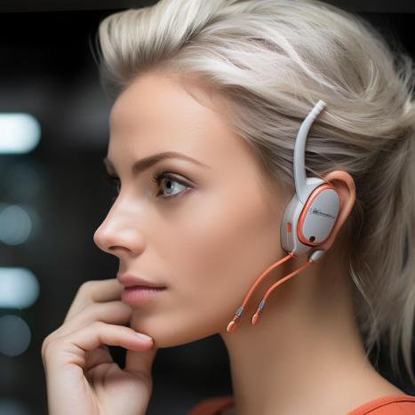 Frau mit High-Tech-Headset für klare Kommunikation.