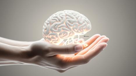 Hände halten ein leuchtendes Gehirnmodell, symbolisiert geistige Gesundheit.