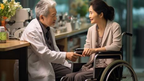 Arzt berät eine Frau im Rollstuhl in einer medizinischen Einrichtung.