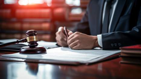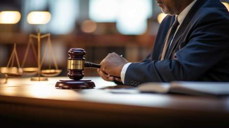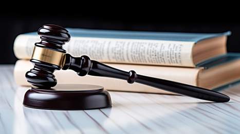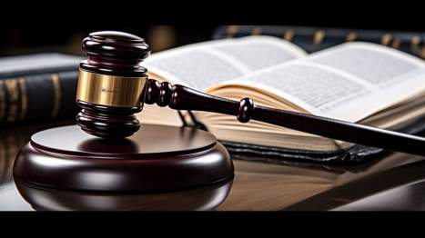 Richterhammer und Gesetzesbücher im Hintergrund.