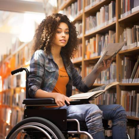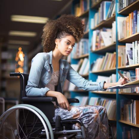 Frau im Rollstuhl sucht Bücher in der Bibliothek.