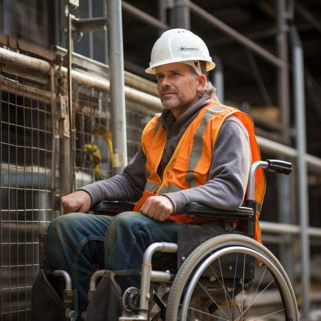 Bauarbeiter im Rollstuhl auf der Baustelle.