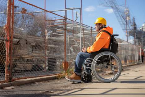 Arbeiter im Rollstuhl auf einer Baustelle.