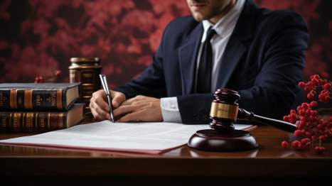 Mann in Anzug verfasst rechtliche Unterlagen, umgeben von Gesetzbüchern und Richterhammer, symbolisiert Rechtsarbeit.