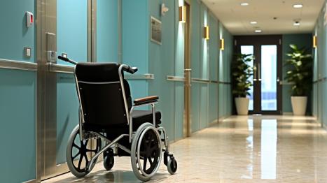 Ein leerer Rollstuhl steht in einem ruhigen Krankenhausflur, bereit für den nächsten Einsatz.