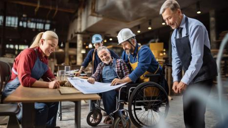 Kollegen in der Werkstatt, besprechen Baupläne, inklusive einer Person im Rollstuhl. Zusammenarbeit im Fokus.