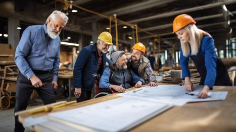 Fachleute in der Fertigung besprechen technische Zeichnungen und arbeiten gemeinsam am Projekt.