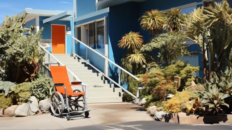 Rollstuhl vor einer Treppe im Außenbereich, umgeben von mediterraner Vegetation und klarer Architektur.