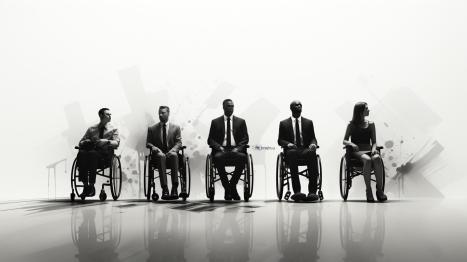 Fünf Fachkräfte im Rollstuhl, stilisiert in Schwarz-Weiß, symbolisieren Vielfalt und Inklusion im Arbeitsumfeld.