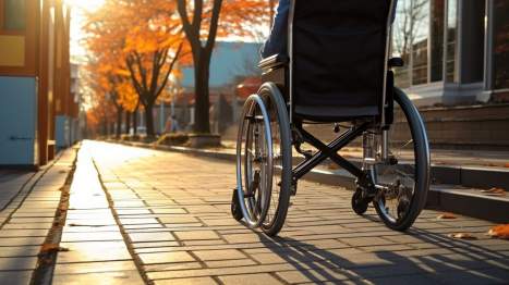 Rückansicht eines Rollstuhlfahrers auf einem barrierefreien Gehweg bei Sonnenuntergang im Herbst.