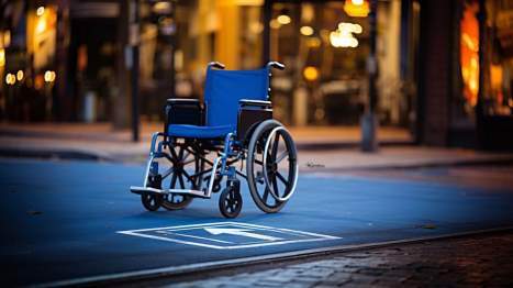 Rollstuhl auf ausgewiesenem Parkplatz für Menschen mit Behinderung.