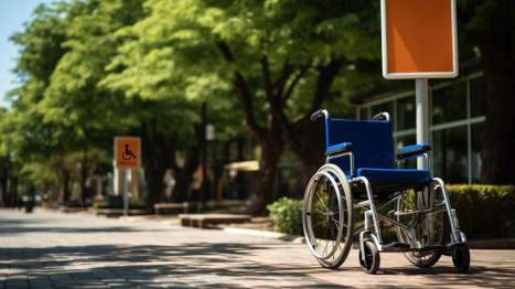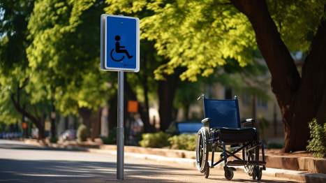 Rollstuhl neben einem Behindertenparkplatz-Schild in einer grünen Umgebung.