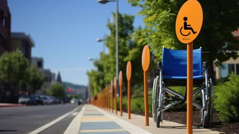 Rollstuhl und Wegweiser für barrierefreie Zugänge in städtischer Umgebung.