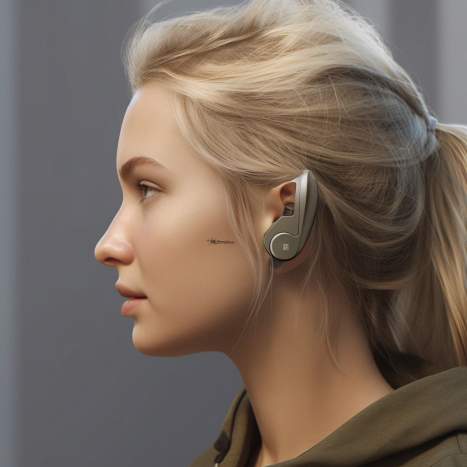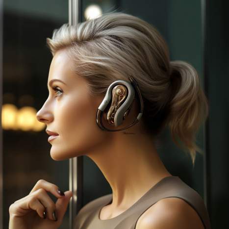 Seitliches Profil einer Frau mit einem modernen Hörgerät.