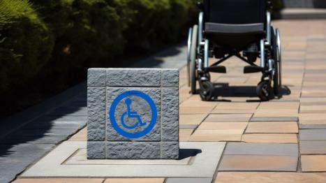 Ein behindertengerechter Weg mit Rollstuhl und blauem Schild.