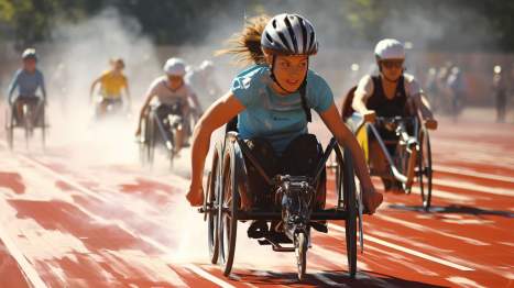 Athleten im Rollstuhl beim rasanten Wettkampf auf der Rennbahn.