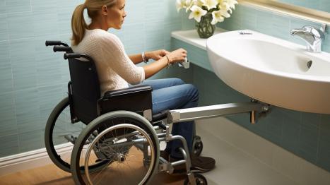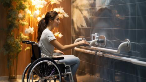 Rollstuhlfahrerin nutzt ein barrierefreies Waschbecken mit Handläufen.