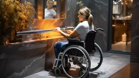 Rollstuhlfahrerin in einem barrierefreien Badezimmer.